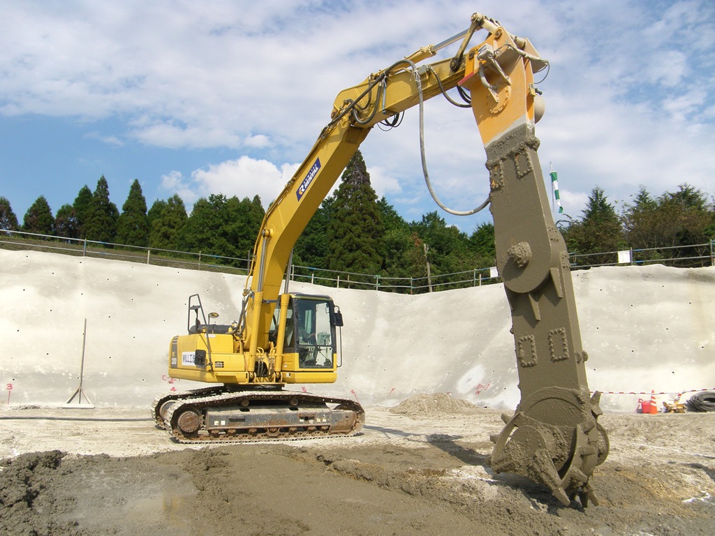浅層混合処理工法は特殊撹拌装置を取り付けたバックホウにより粉体あるいはスラリー状の固化材を原位置土と強制的に混合撹拌する工法です。