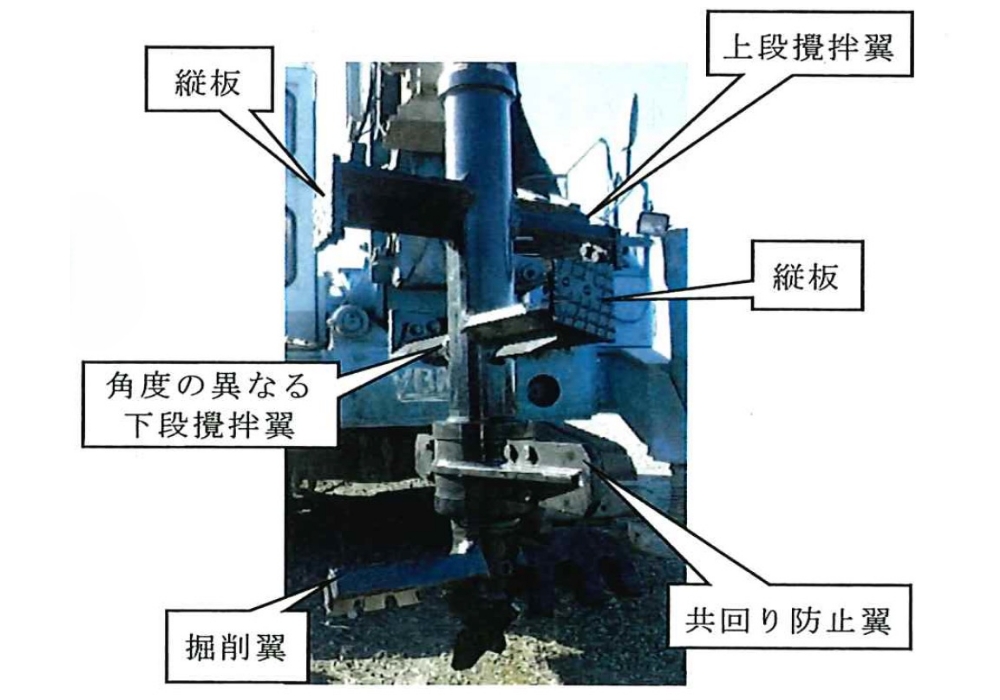 • 改良杭の鉛直性を確保するため、上下2段の攪拌翼の外側に鉛直版を装着している。
