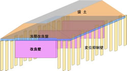 • 側方流動に対して改良壁が抵抗力となり安定性が増加します。また、変位抑制壁を設けることにより、周辺地盤の沈下と変位抑制ができます。