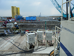 CPG工法は、極めて流動性の低いモルタルを地盤中へ静的に圧入することで周辺地盤を締固める工法です。コンパクトな設備により上空制限のある場所や既設構造物の内部など、狭い作業空間でも施工が可能です。既設構造物直下地盤の液状化対策に有効な工法です。