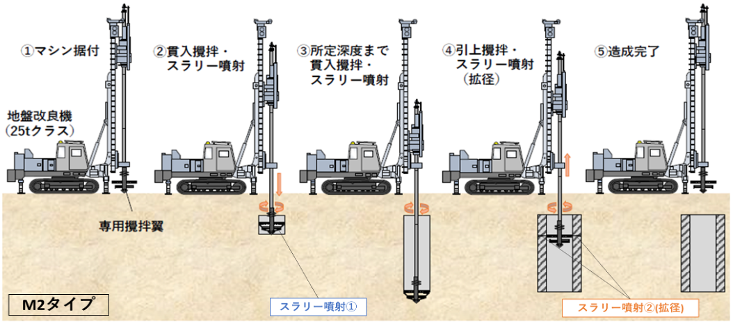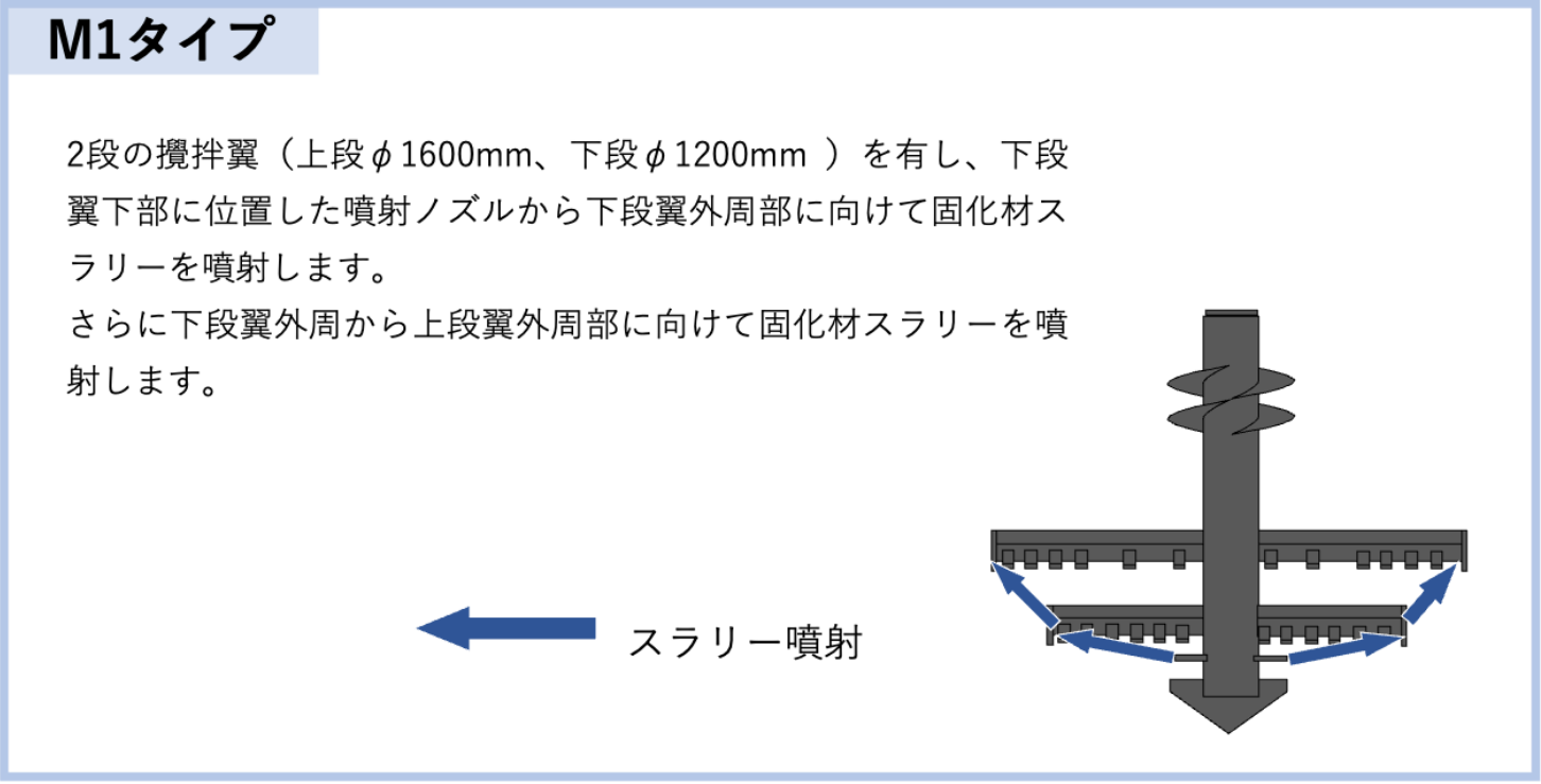 HCM工法は固化材スラリーを噴射できる特殊ノズルと攪拌翼を組み合わせた攪拌装置を用いて噴射攪拌を行い、2タイプ(M1タイプ、 M2タイプ)を選択できます。