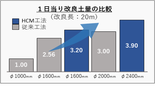 従来工法(改良径φ1600mm)と比較して、攪拌時間を40%削減、固化材量を20%削減できます。 -