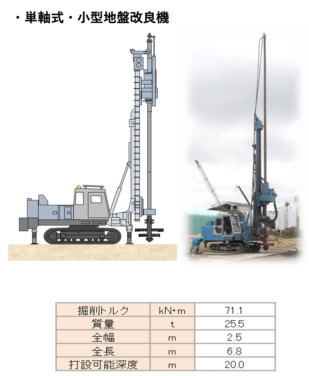 複合噴射攪拌により、従来工法より短時間に大口径の改良体を構築できます。 これにより小型地盤改良機でありながら、従来工法を上回る能率で施工することができます。 -