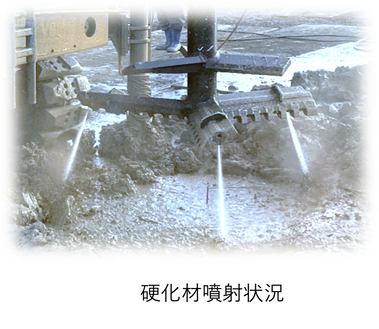 固化材スラリーを高圧で噴射するため、「連れ回り」や「供回り」による混合不良のリスクが低減します。高圧での噴射により土塊が解砕され、混合が均一に行われます。