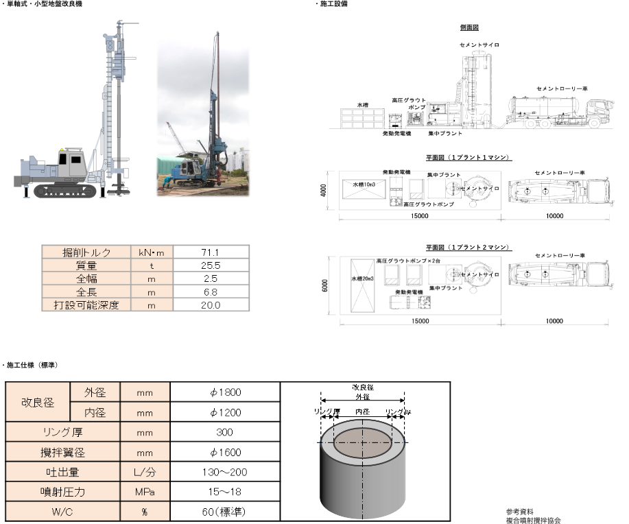 リングジェット工法は、円柱状(リング状)の形状特性による高強度改良体(円筒状改良体)をセメントスラリー式の小型地盤改良機にて、専用攪拌翼を用いて、大口径かつ効率的に施工可能な深層混合処理工法です。